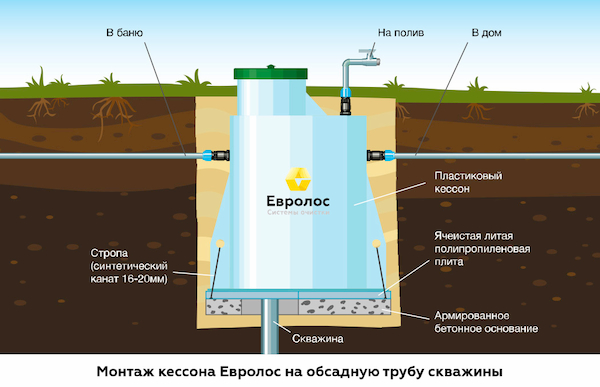 Установив кессон на бетонное основание, он якорится подготовленными ранее шнурами через монтажные проушины в корпусе кессона. Далее, на обсадную трубу, монтируется уплотнительное кольцо, а также ответный фланец герметичной муфты обсадной трубы и равномерно затягиваются все болтовые соединения. Перед тем как приступить к обратной засыпке пазух котлована, нужно ввести в кессон магистральные трубы водоснабжения и электрический кабель.
