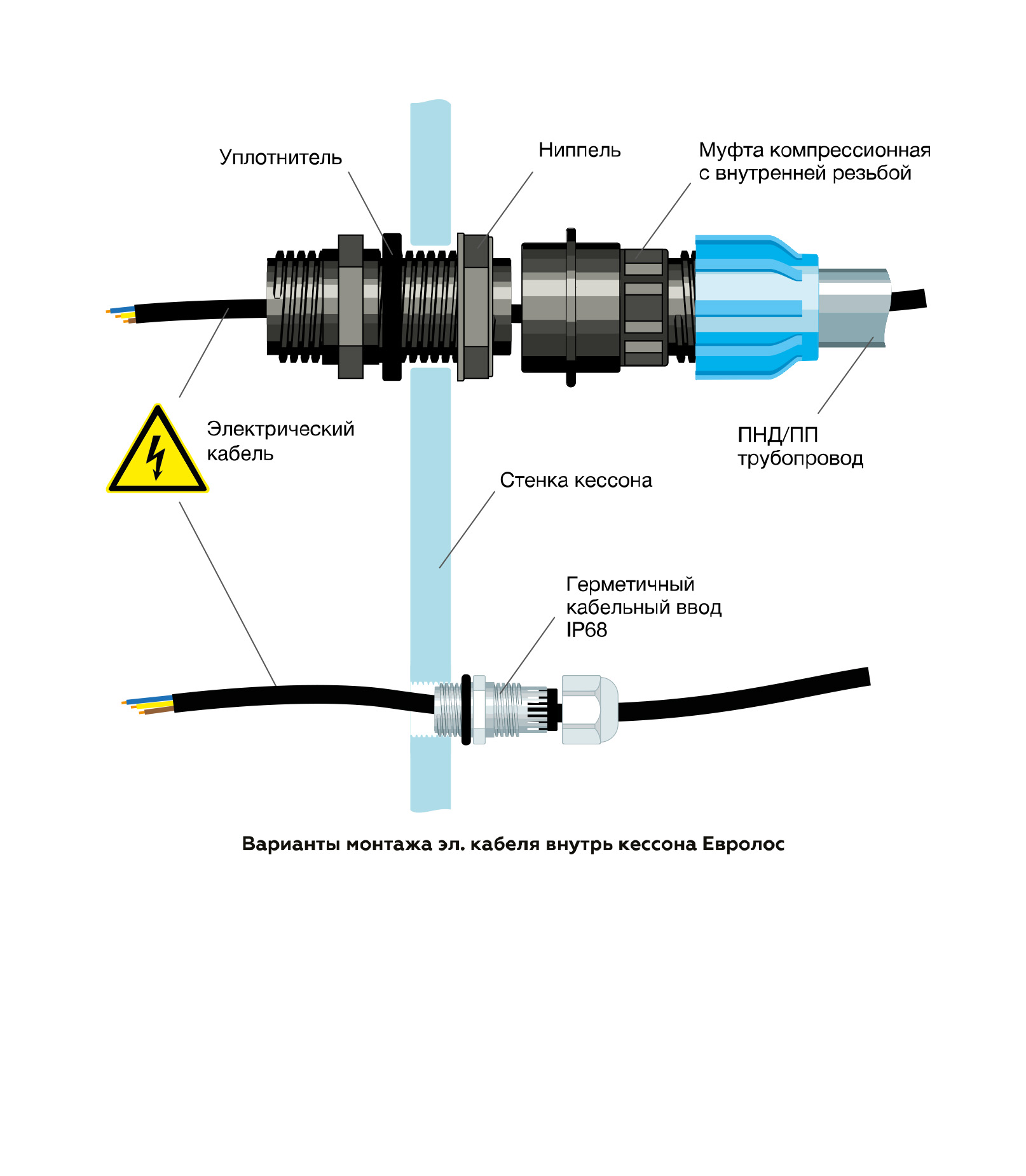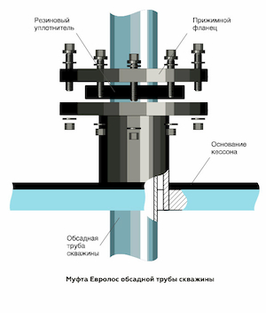 Если кессон поставляется вместе с герметичной муфтой Евролос для обсадной трубы скважины, то её необходимо предварительно разобрать. Для этого необходимо раскрутить все болтовые соединения, снять верхний фланец и уплотнительное кольцо. Обсадная труба скважины обрезается так, чтобы она выступала из бетонного основания не более чем на 500 мм. Пластиковый кессон необходимо поднести и сориентировать относительно приемной трубы в основании кессона. При опускании кессона обсадная труба скважины должна войти в приемную трубу герметичной муфты.